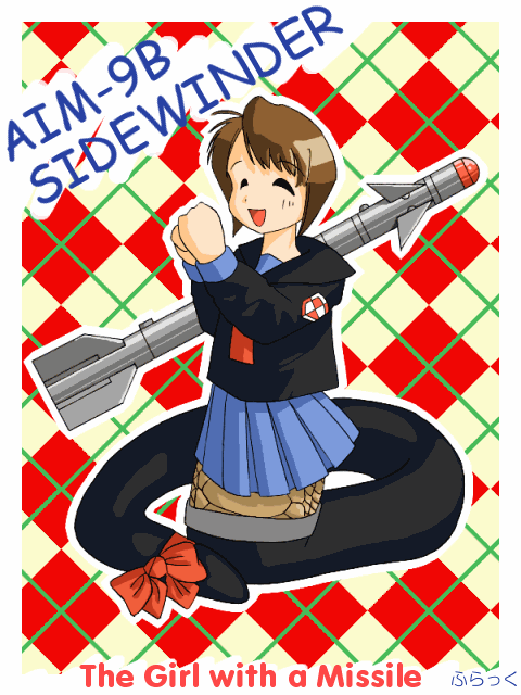 2匹目のドジョウ。サイドワインダー&へび娘。一応2万アクセス記念扉絵を飾りました。ま、今年が巳年ということで。つうか、結構このキャラ、気に入っていたりしています。 前回がAIM-9Lだったので、今回はダウングレードしてAIM-9B。このミサイルはサイドワンダーの初期型であり、赤外線シーカーの能力が低いため、前方へ輻射される排気熱を関知することはできません。よって後ろから撃ち込まないと命中は期待できないモノです。