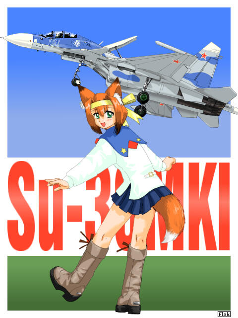 フランカーシリーズからSu-30MKIと、ロシア担当のキツネ娘セレのショットです。なんか、またセレの顔が変わっています。つかみ所が少ない娘だこと(笑)。なおSu-30MKIは、試作2号機のカラーリングです(潰れて良く見えませんが、機首の番号は06です)。だからインド空軍のラウンデルでなく、ロシアの星印なんです。今回タンデム複座のフランカーを初めて描きましたが、いや本当に格好良いですよね。実は単座のSu-35よりも格好良く思えてきています(笑)。