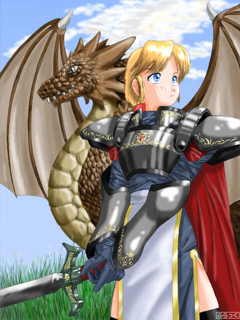 平原におちる陽光を、巨大な影が遮る。 鎌首をもたげ、翼を開き警戒姿勢をとる竜。 その傍らでは、剣を抜き、同じように身構える騎士がいる。 彼女らにとっての敵、それはすぐ近くまで来ていた。 黒壁さんのHP「黒壁堂」との相互リンク記念に差し上げたイラストです。 久しぶりにファンタジー路線で行こうと考えたのですが、初挑戦のドラゴンはなんともひどい出来。かといってウロコがないと締まらないし(笑)。足を描くだけのスペースがなかったため、密かにワームに見えてしまいます。
