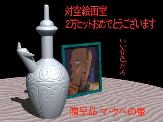 「マ・クベの壷」 「War Birds Museum」を運営なさっているchikaponさんより、HP20000ヒット記念に頂きました。贈呈品にはコレ!と贈ってくれたのは、かの有名な「マ・クベの壷」。サイド5で、自らギャンに搭乗しガンダムと戦うも、半歩力が及ばず無念の最後をとげたマ・クベ大佐。その最後に、お気に入りの壷をキシリア閣下に渡すよう遺言した彼は、まさにジオン軍の求める、理想的な将校だったと言えるでしょう。 「あの壷をキシリア様に。あれは良いモノだぁぁぁ〜〜〜」(ちゅど〜ん)