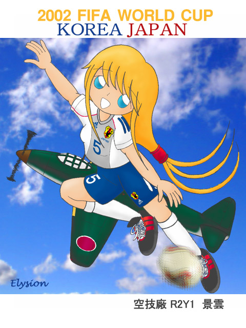 日本のアウェー用ユニフォームで決めた、Elysionさんトコの看板娘・真理亜ちゃんです。バックは日本海軍の試作高々度偵察機・景雲です。熱田三〇型水冷エンジンをタンデム接続したハ七〇エンジンを胴体中央に搭載、そこから4mもの延長軸を介して6葉のプロペラを回すという、大胆とも無謀とも言える設計でした。最高速度780km/hをうたった本機も、戦局の悪化に伴う開発整理により消滅してしまいました。