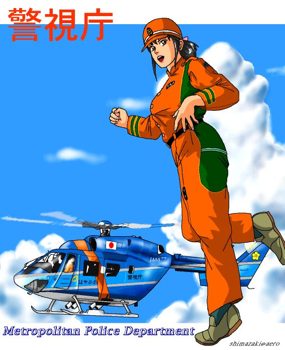 「はやぶさ」 「島崎の部屋」を運営なさっている島崎さんより、弊ページ6万ヒット記念に頂きました。警視庁のパトロールヘリ「はやぶさ」こと、BK117です。本当は警視庁で使用しているヘリはBK117ではないそうですが、ここはイラストとのマッチングを考えてとのこと。ヘリのパイロットスーツは、青ではなくてオレンジ基調なんですね(笑) 最後になりましたが、どうもありがとうございます。